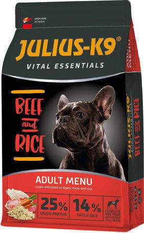 Összetétel: Hús és állati származékok (marha húsliszt 12%, baromfi húsliszt 10%, hal húsliszt 5%, zsír(szárnyasmentes) min. 8%), feltárt kukorica, korpa, rizs, kukoricaliszt, búza, alma, sárgarépa, yucca schidigera kivonat 500mg/kg