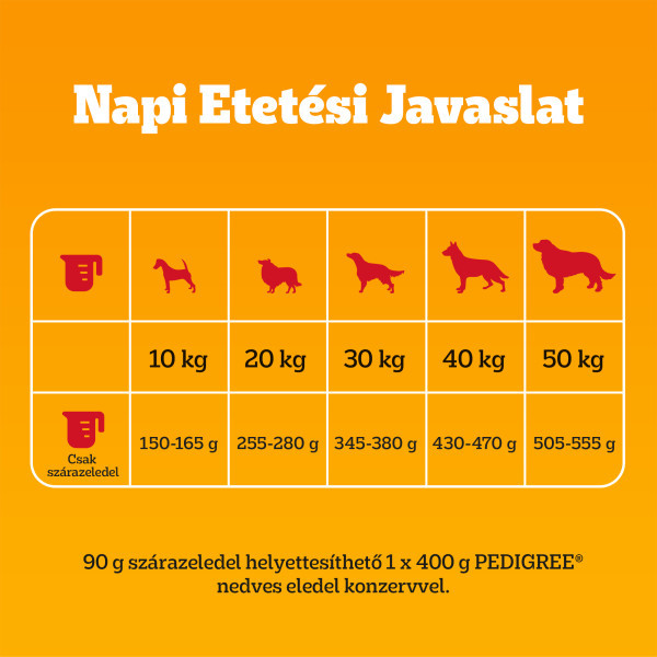 Számolja a jutalomfalatokból származó kalóriát. Az etetési mennyiségek csak iránymutatásként szolgálnak. A kutya életkorának, méretének és aktivitási szintjének megfelelően határozza meg az eledel mennyiségét. Az egész napos etetéshez ossza el adagokra. Kérjük, étrendváltáskor fokozatosan vezesse be az eledelt. További információkért kérjük, látogasson el weboldalunkra. Kínáljon hozzá friss vizet. Száraz, hűvös helyen tárolandó. Napi Etetési Javaslat 10kg: 150 - 165 g 20kg: 255 - 280 g 30kg: 345 - 380 g 40kg: 430 - 470 g 50kg: 505 - 555 g 90 g szárazeledel helyettesíthető 1 400 g PEDIGREE® nedves eledel konzervvel.