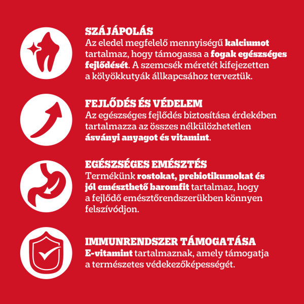 Szájápolás: Speciálisan kialakított textúrája, amely segít a fogak tisztításában. Fejlődés és védelem: Az egészséges fejlődés biztosítása érdekében tartalmazza az összes nélkülözhetetlen ásványi anyagot és vitamint. Egészséges emésztés: Termékünk rostokat, prebiotikumokat és jól emészthető baromfit tartalmaz, hogy a fejlődő emésztő rendszerükben könnyen felszívódjon. Immunrendszer támogatása: E-vitamint tartalmaznak, amely támogatja a természetes védekezőképességet.