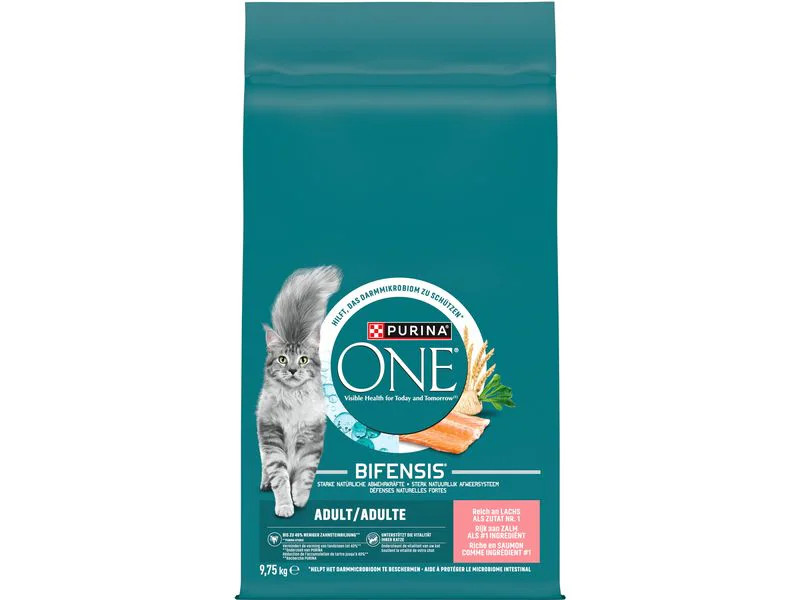 A PURINA ONE Adult lazac & teljes kiőrlésű gabona teljes értékű eledel macskáknak.